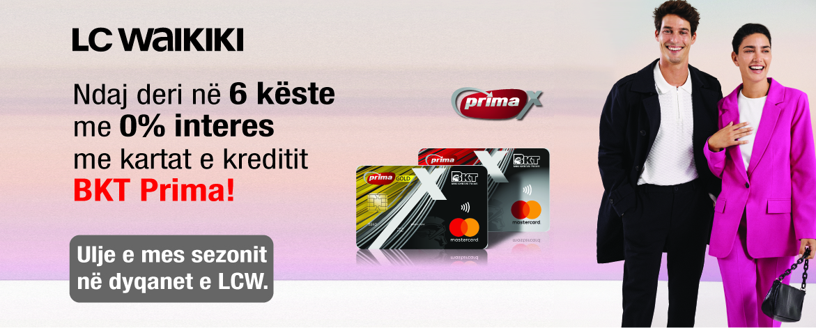 Deri në 6 këste me 0% interes në LC Waikiki!Blini me kartat e kreditit BKT Prima në të gjithë rrjetin e dyqaneve LC Waikiki dhe ndani blerjet deri në 6 këste me 0% interes! Prima, karta e mundësive eXtra!