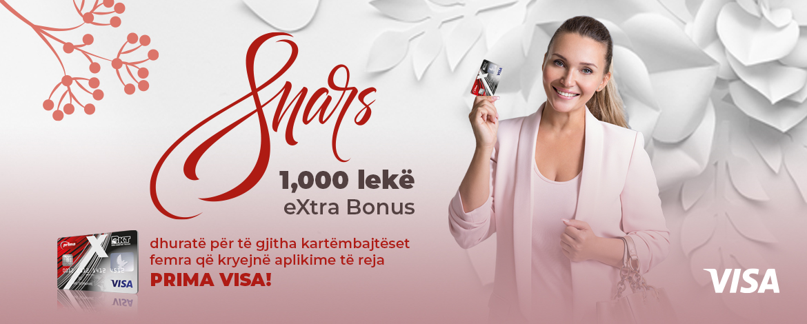 Happy 8th of March with Prima credit cards! All female cardholders who apply for a new VISA credit card will be rewarded with 1,000 ALL eXtra Bonus!