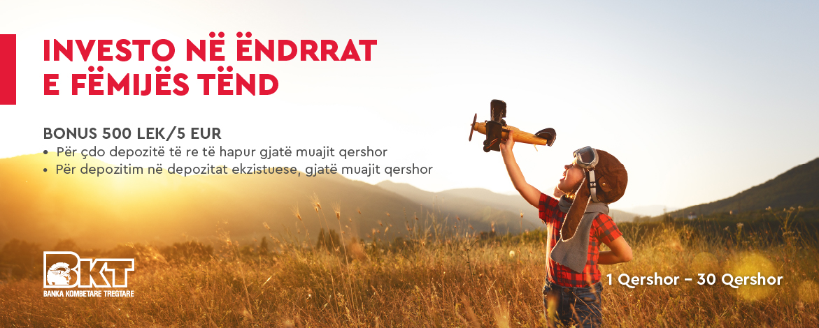 - Për depozitim në depozitat ekzistuese’Femija im”, gjatë muajit qershor. Minimumi i shumës së depozituar duhet të jetë 10.000LEK/100 EUR. Bonusi jepet vetëm për depozitimin e parë të bërë gjatë muajit.
